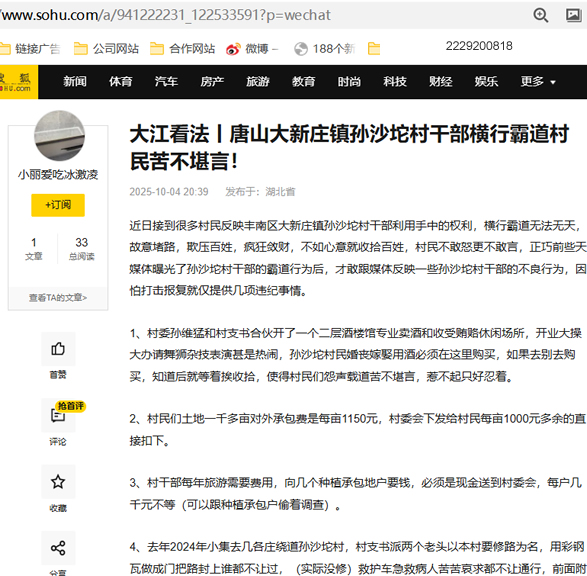 近日接到很多村民反映丰南区大新庄镇孙沙坨村干部利用手中的权利,横行霸道无法无天,故意堵路,欺压百姓,疯狂敛财,不如心意就收拾百姓,村民不敢怒更不敢言,正巧前些天媒体曝光了孙沙坨村干部的霸道行为后,才敢跟媒体反映一些孙沙坨村干部的不良行为,因怕打击报复就仅提供几项违纪事情。